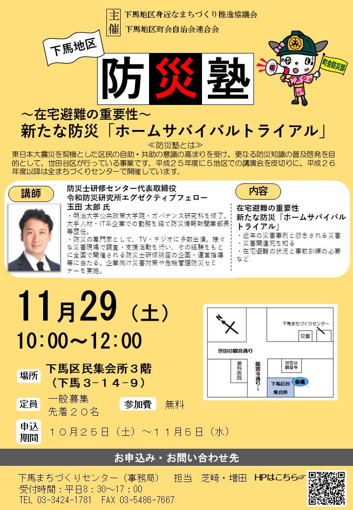 世田谷区トップページ > 世田谷地域 > 下馬地区 > お知らせ一覧 > 下馬地区防災塾を開催します!
