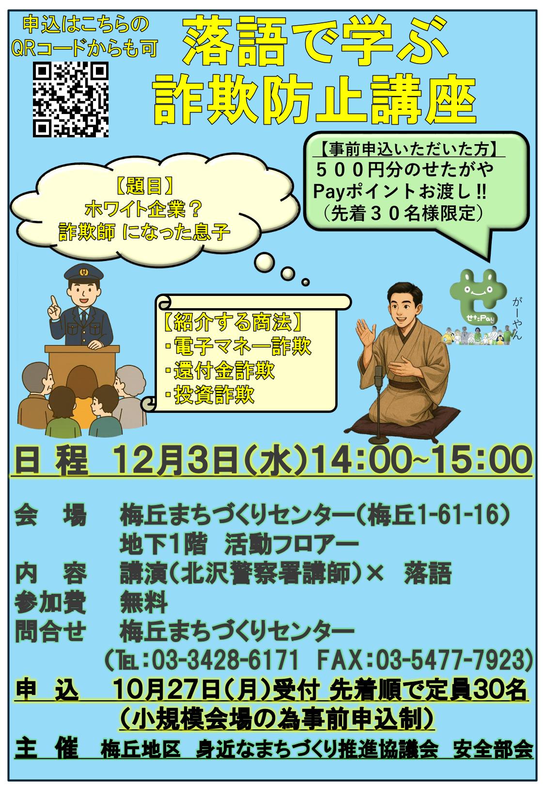 梅丘まちづくりセンターにて「落語で学ぶ詐欺防止講座」を開催しました!
