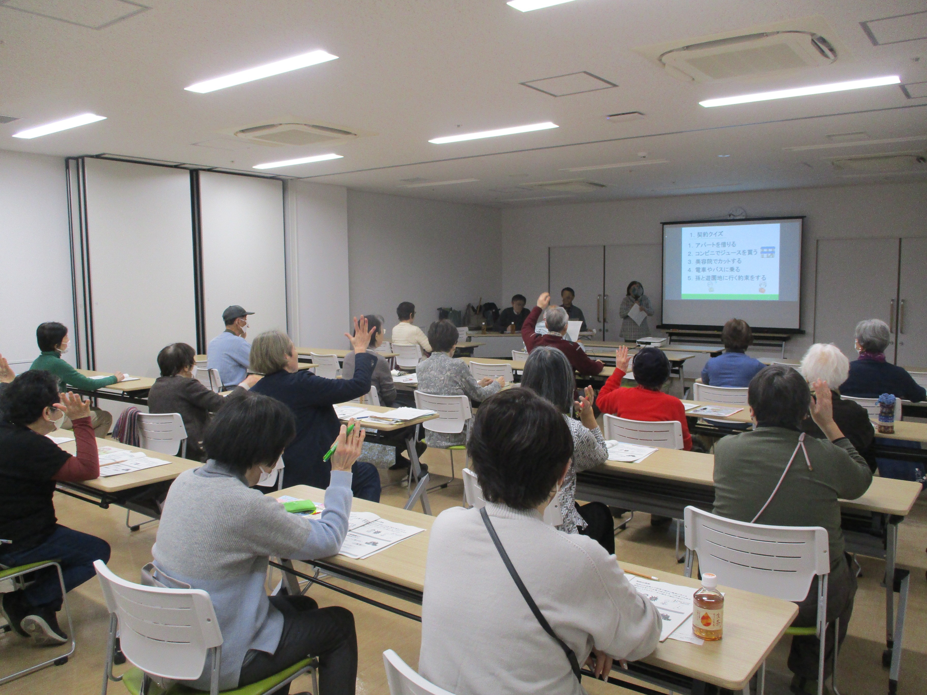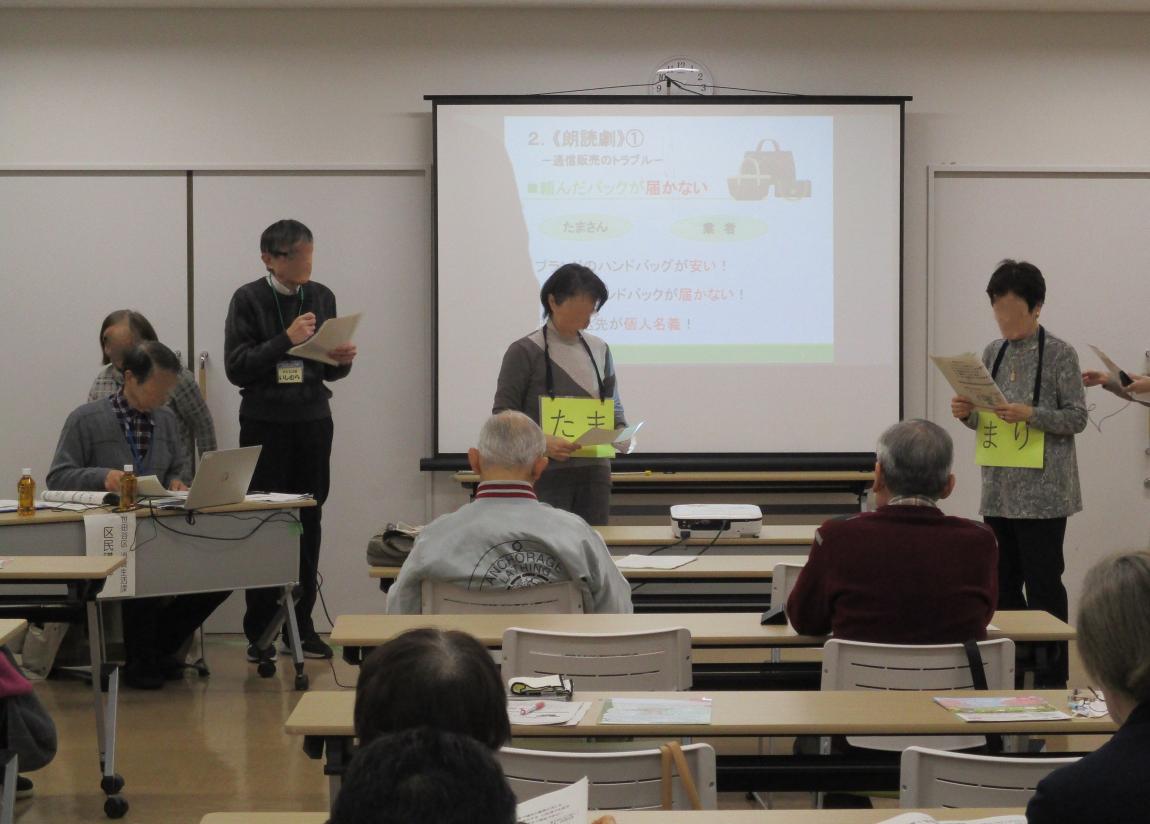 消費生活課の区民講師を招き、今回のテーマである「通信販売トラブル」について、朗読劇やクイズなどを交え、通信販売における注意点を学びました。
