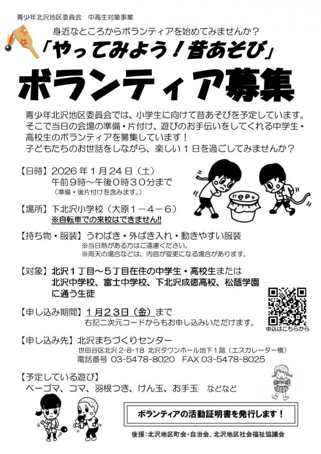 青少年北沢地区委員会主催「やってみよう!昔あそび」のボランティアを募集しています!