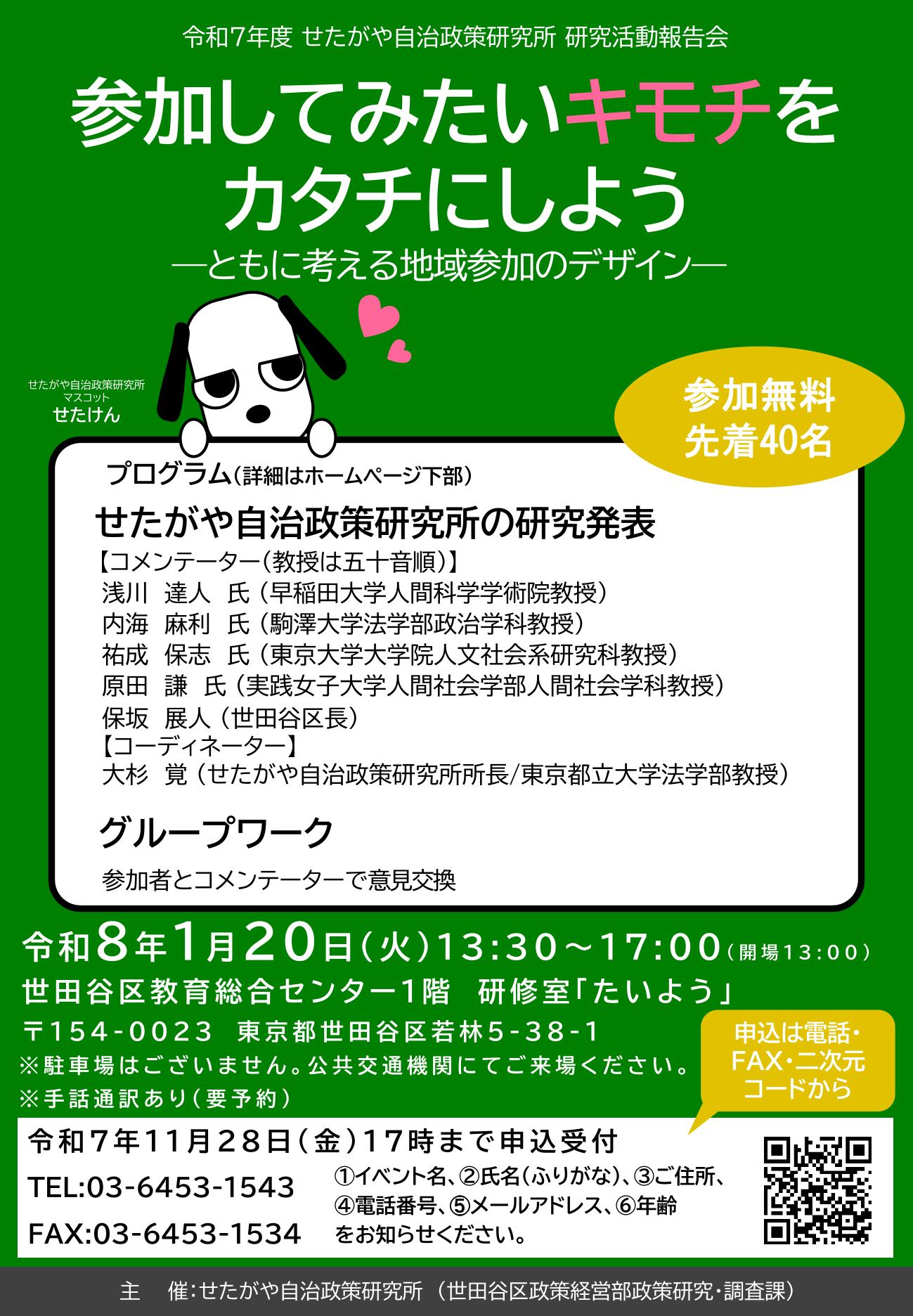 世田谷区トップページ > 区政情報 > 区の政策 > せたがや自治政策研究所 > せたがや自治政策研究所からのお知らせ > 令和7年度研究活動報告会を開催します
