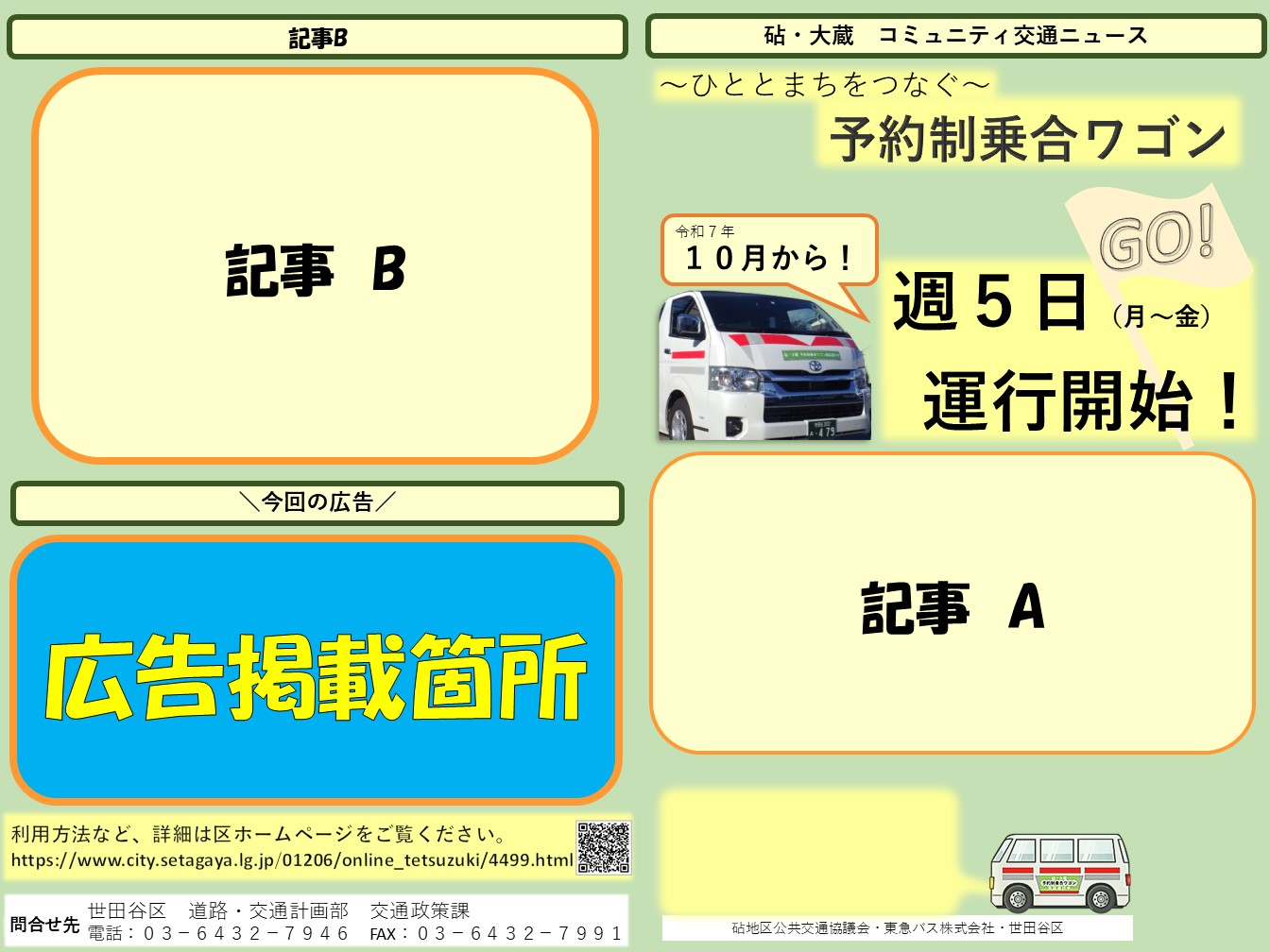 世田谷区トップページ > 住まい・街づくり・環境 > 交通 > 交通に関する計画・方針等 > 砧・大蔵地区予約制乗合ワゴン運営協賛・広告募集