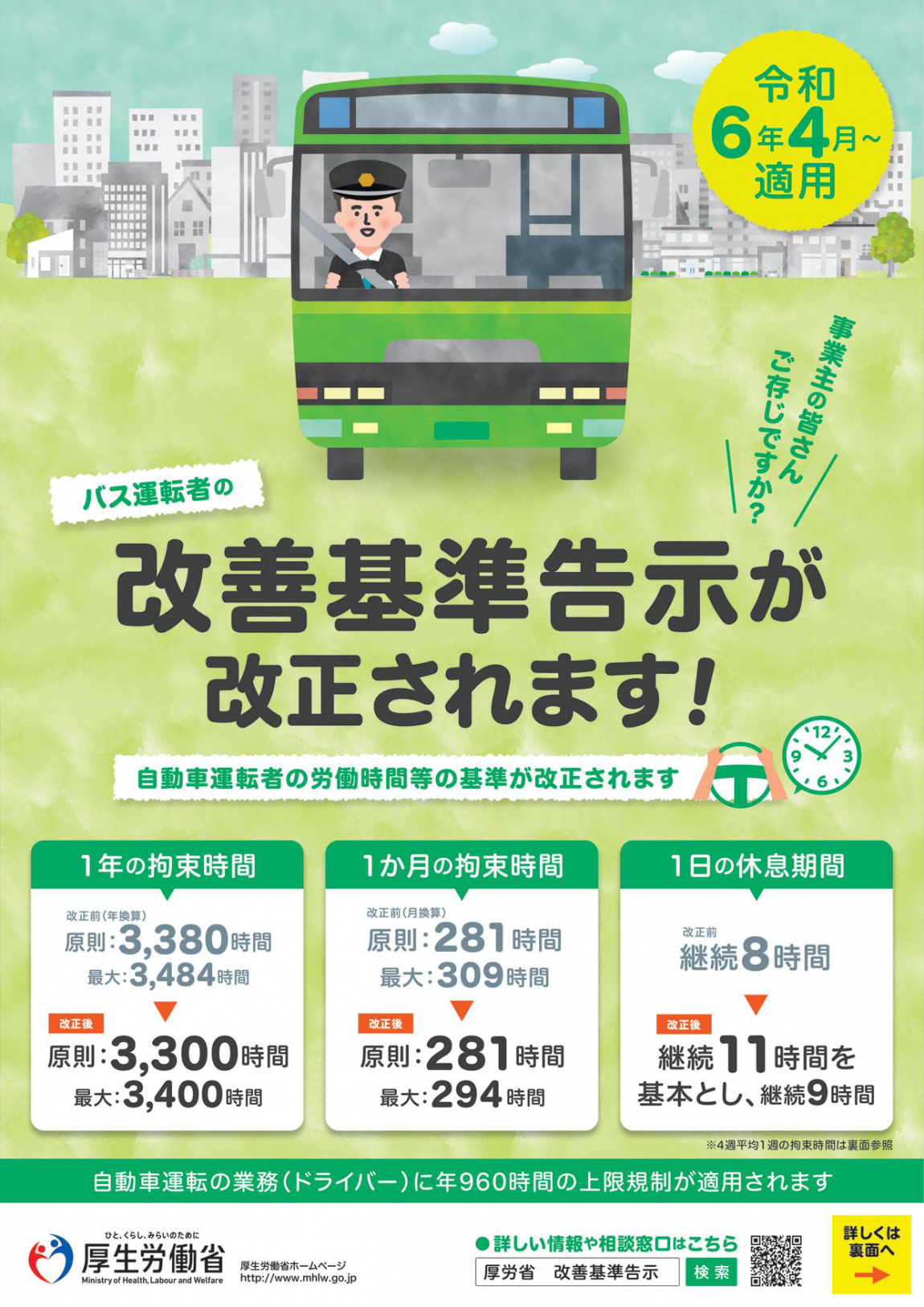 バス運転手等の労働環境を改善するため、長時間の運転に制限をかけることや休息時間を長くするなど、働き方改革により基準が変わり、限られたバス運転手数で、現在のバス運行本数を維持することが難しくなってきています。
