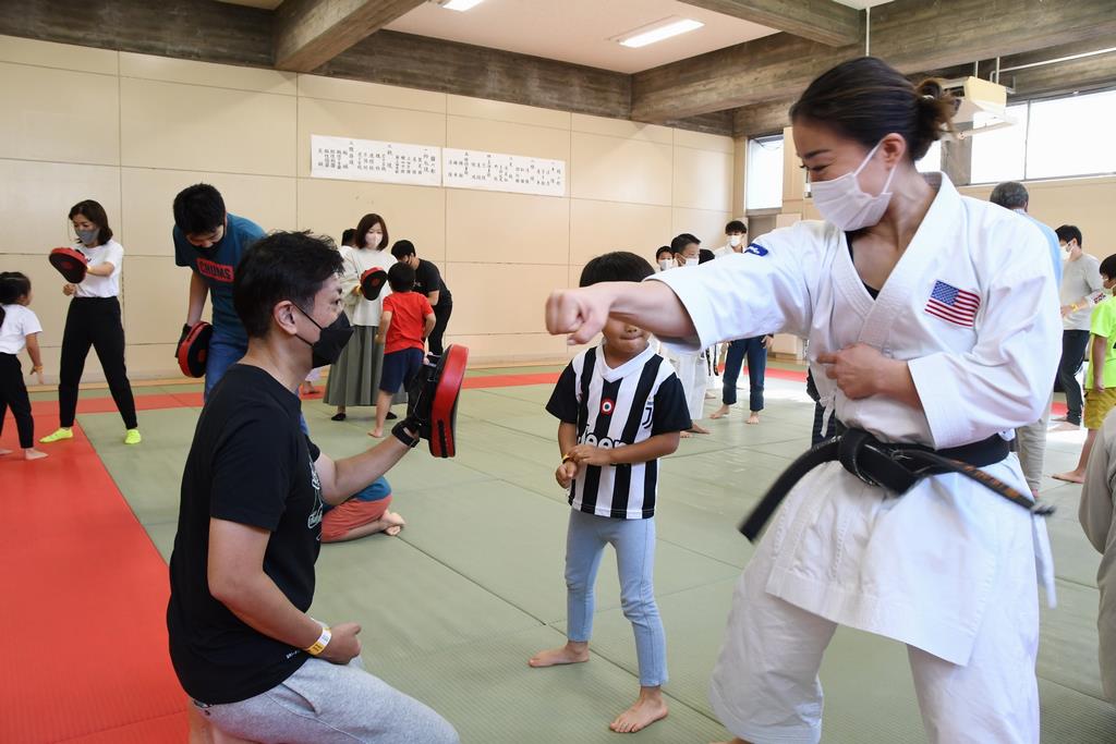 東京2020大会米国空手(形)代表の國米櫻選手が区民スポーツまつりの空手体験コーナーに参加しました。國米選手は東京2020大会以来の来日で、イベントでは参加者への空手のアドバイスやミット打ち、演武の披露を行い、最後に来場者との記念撮影を行いました。