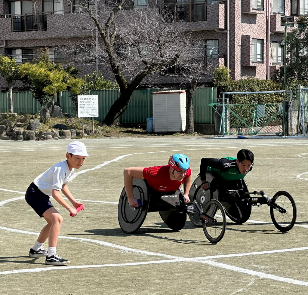 パラ陸上日本記録保持者(100m、800m)の古畑篤郎選手と、講話を対談形式で行いました。自身の障害についてや車いすレーサーの魅力、パリ2024大会に向けた抱負などをお話しいただき、児童から質問も受け付けました。また、児童は前日に行われた東京マラソン準優勝の銀メダルに触らせてもらったほか、車いすレーサーの乗車体験や、校庭で両選手のデモンストレーションを見学しました。