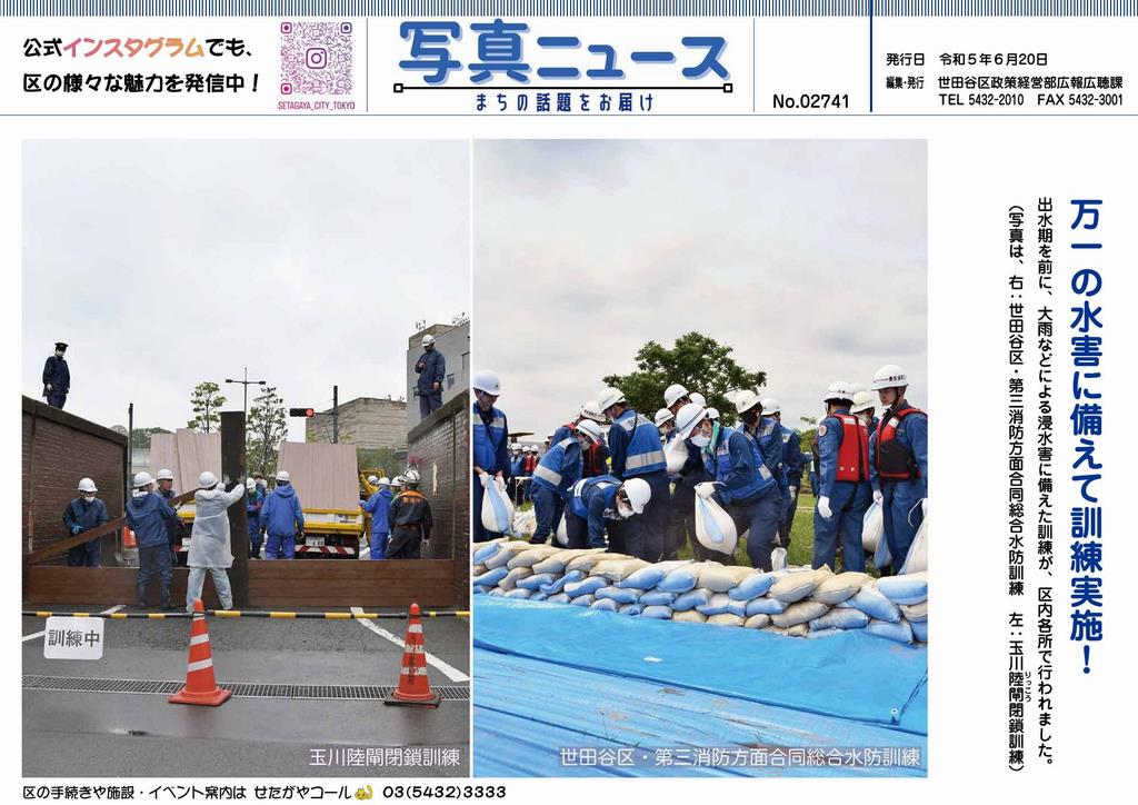 (写真は、右:世田谷区・第三消防方面合同総合水防訓練 左:玉川陸閘(りっこう)閉鎖訓練)