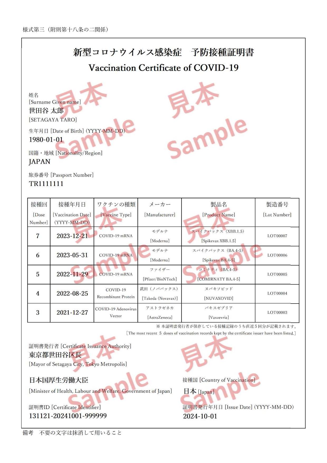 自治体に登録されている接種記録が6件以上ある場合、そのうち直近5回分の接種記録が接種証明書に記載されます。