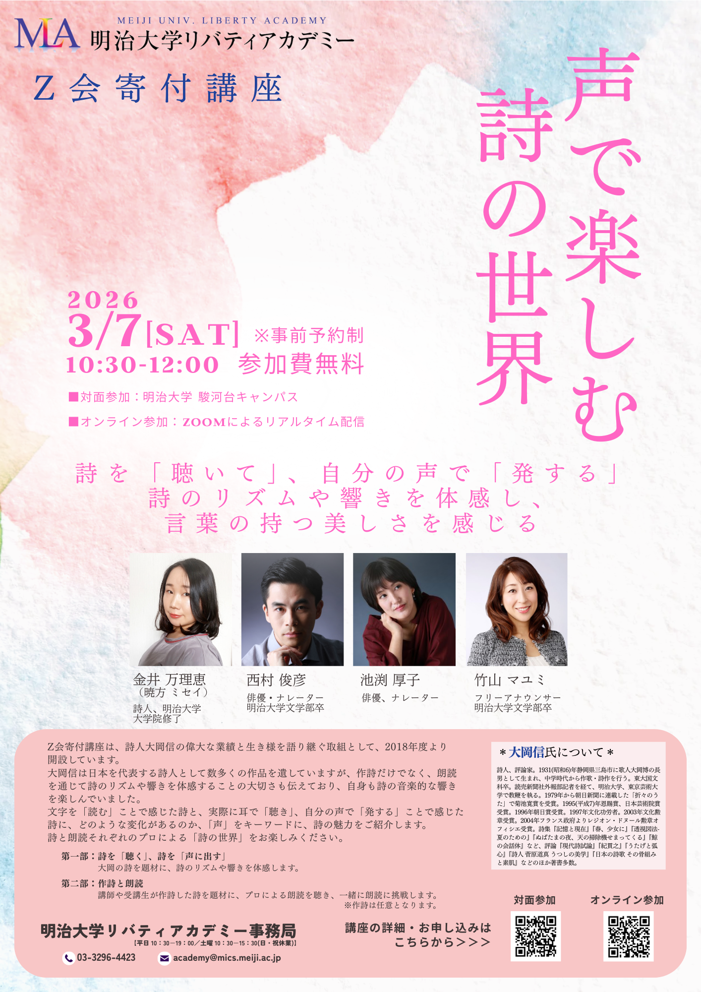 | 【ハイブリッド/オンデマンド】 小栗忠順の生涯-時代を先読みした幕臣- 《明治大学連合駿台会寄付講座》 | 2026年3月7日(土曜日)~3月31日(火曜日) | オンデマンド配信 |