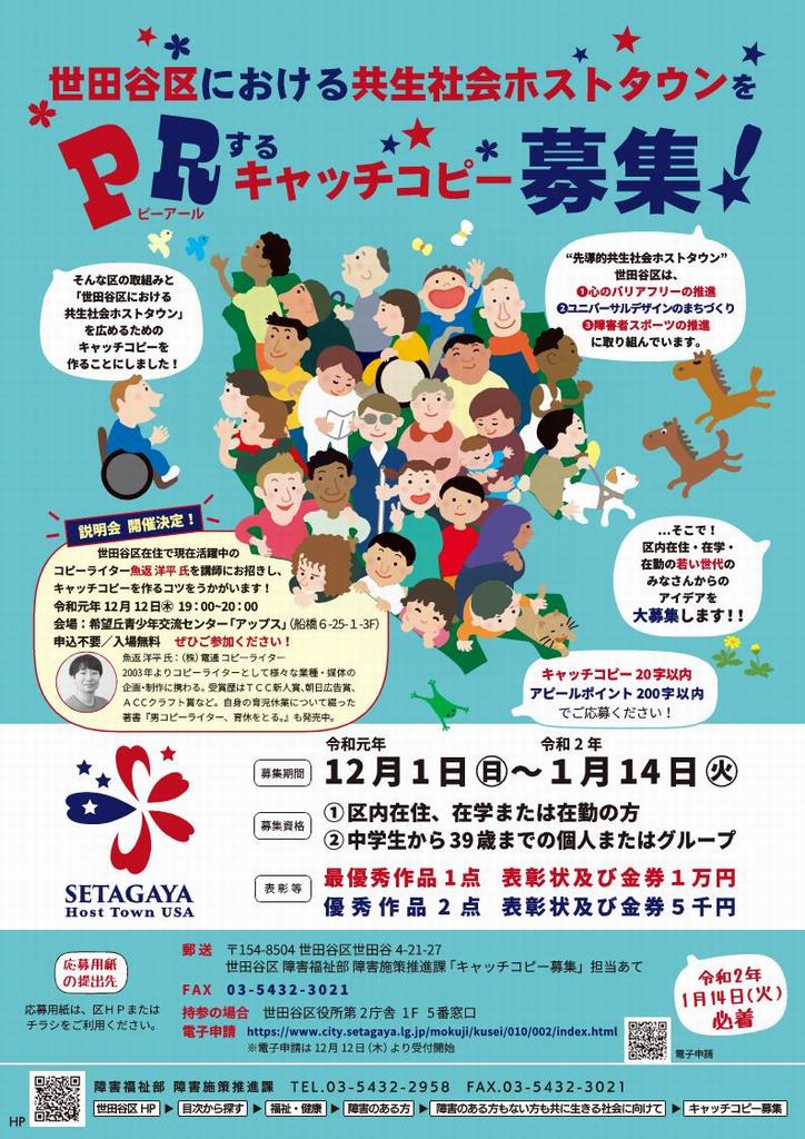 区がアメリカ合衆国の共生社会ホストタウンであることを周知するため、柔軟な発想を持つ若い世代を対象として、世田谷区共生社会ホストタウンPR「キャッチコピー」を公募し、選定の結果、以下の作品に決定しました。
