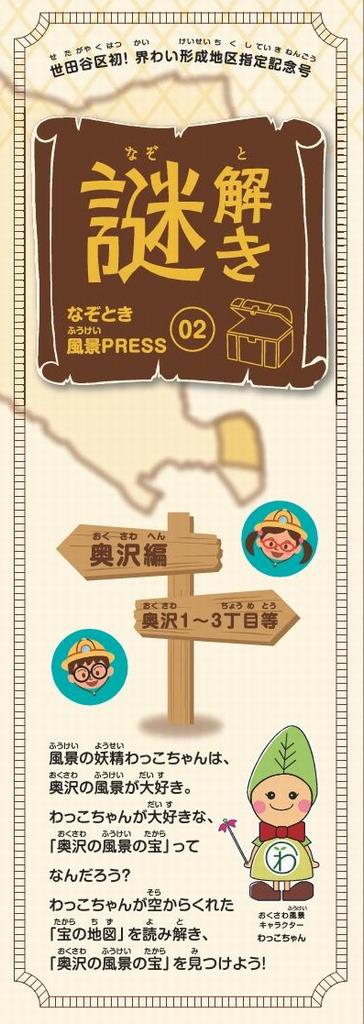 奥沢1~3丁目等にあるなぞときにチャレンジして、奥沢の風景にひそむ「なぞ」をとき明かそう!冊子に書かれたなぞをといていくと「奥沢の風景の宝」に通じるキーワードが手に入るよ。