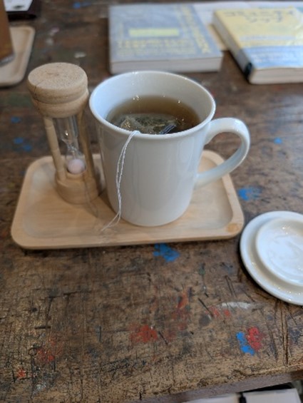 下北線路街の中でも活動場所のコアとなる場所にそびえたつ建物「こや」に案内された私たちは、隣接する「ちゃや」でオーダーしたハーブティをいただきました。