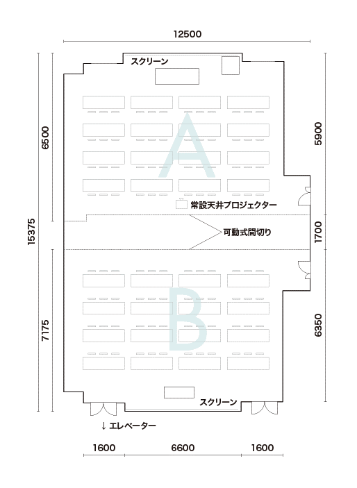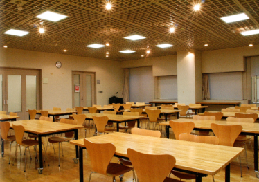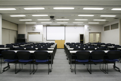 常設の机・椅子・音響設備を使った講演会・学習会に適したスペースです。プロジェクターを使用したプレゼンテーションなども行えます。また、パーテーションを取り外すと最大120人(机を使用しない場合)の大講演会も可能です。(写真はセミナールームA)