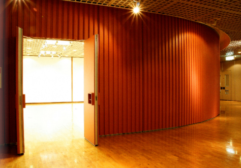 ワークショップルームBは、扇形の壁面が特徴的な展示向けのスペースです。可動式展示パネルを動かすことで、室内のレイアウトが変更できます。ピクチャーレールから展示ワイヤーを吊り下げたり、展示台を各所に配したりなどして、多様な展示を行うことができます。