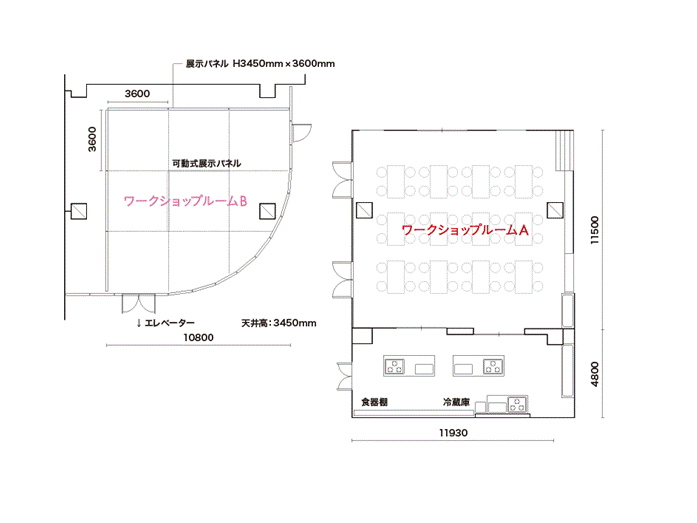 ワークショップルームA:50名 / 126平方メートル+コミュニティキッチン63 平方メートル