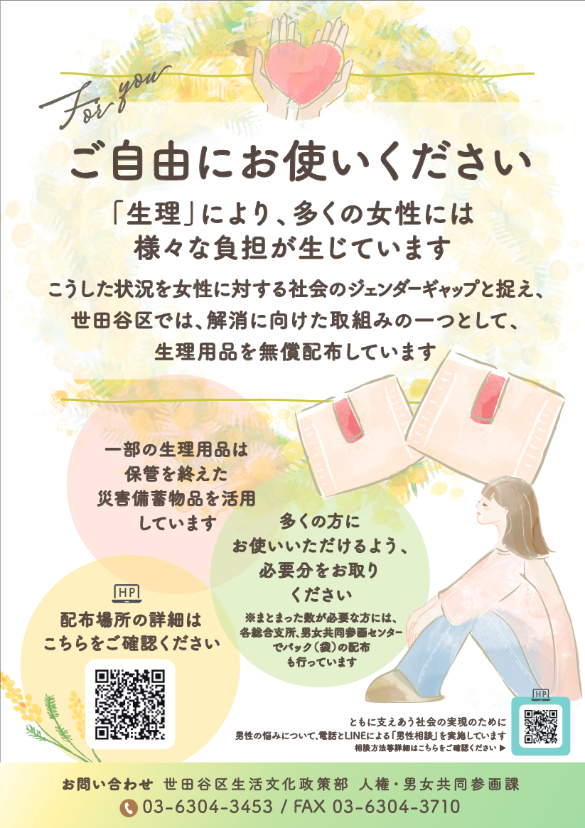 世田谷区トップページ > くらし・手続き > 人権・男女共同参画・平和 > 男女共同参画推進事業 > 令和8年4月1日より区の一部施設のトイレに生理用品を無償設置します