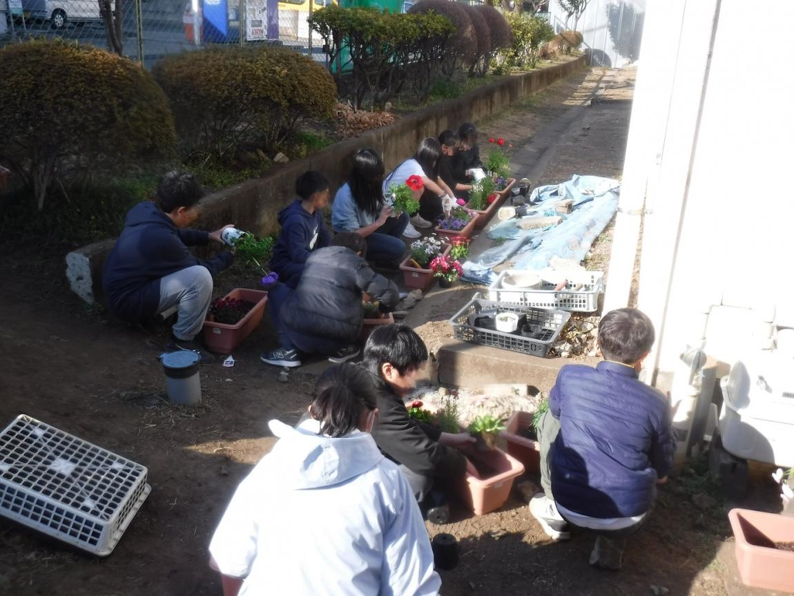 毎年2月から3月頃に、二子玉川小学校、瀬田小学校、瀬田中学校の花壇の補植に協力しています。瀬田小学校では栽培委員会の児童たちと一緒にプランターに花を植えています。