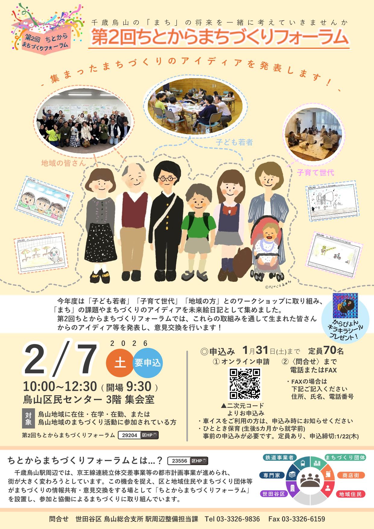 千歳烏山駅周辺では、京王線連続立体交差事業等の都市計画事業が進められ、街が大きく変わろうとしています。その機会を捉え、区と地域住民やまちづくり団体等がまちづくりの情報交換・意見交換をする場として「ちとからまちづくりフォーラム」を設置し、参加と協働によるまちづくりに取り組んでいます。