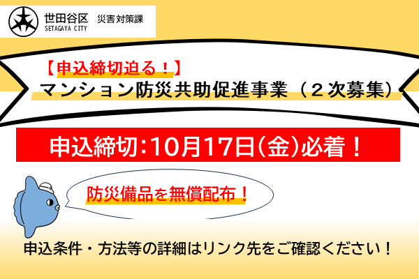 新着情報 マンション防災共助促進事業(2次募集)実施!(9月18日午前9時から申込受付を開始します) 2025年9月24日