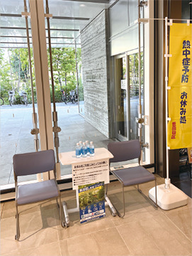 夏本番です。熱中症予防をお願いします。屋内での対策も大切です。のどが渇く前に早めの水分補給と、夜間を含めた適切なエアコン使用をお願いします。区内で外出の際は「お休み処」もご利用ください。場所は「せたがや涼風マップ」に掲載しているほか、黄色いのぼり旗が目印です。