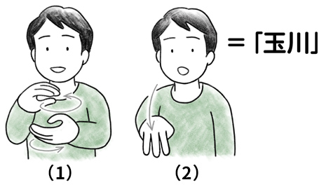 (2)右手3指を広げたまま下におろして、「川」を書く。