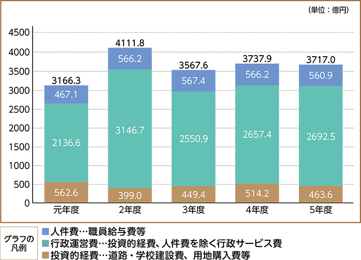 5年度:合計 3717.0億円(人件費 560.9億円、行政運営費 2692.5億円、投資的経費 463.6億円)